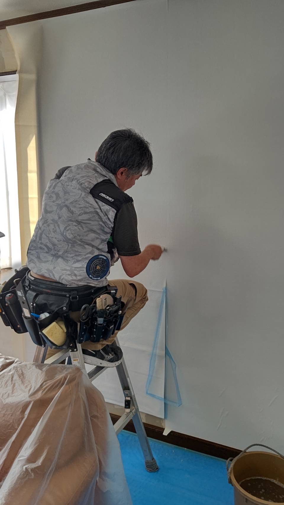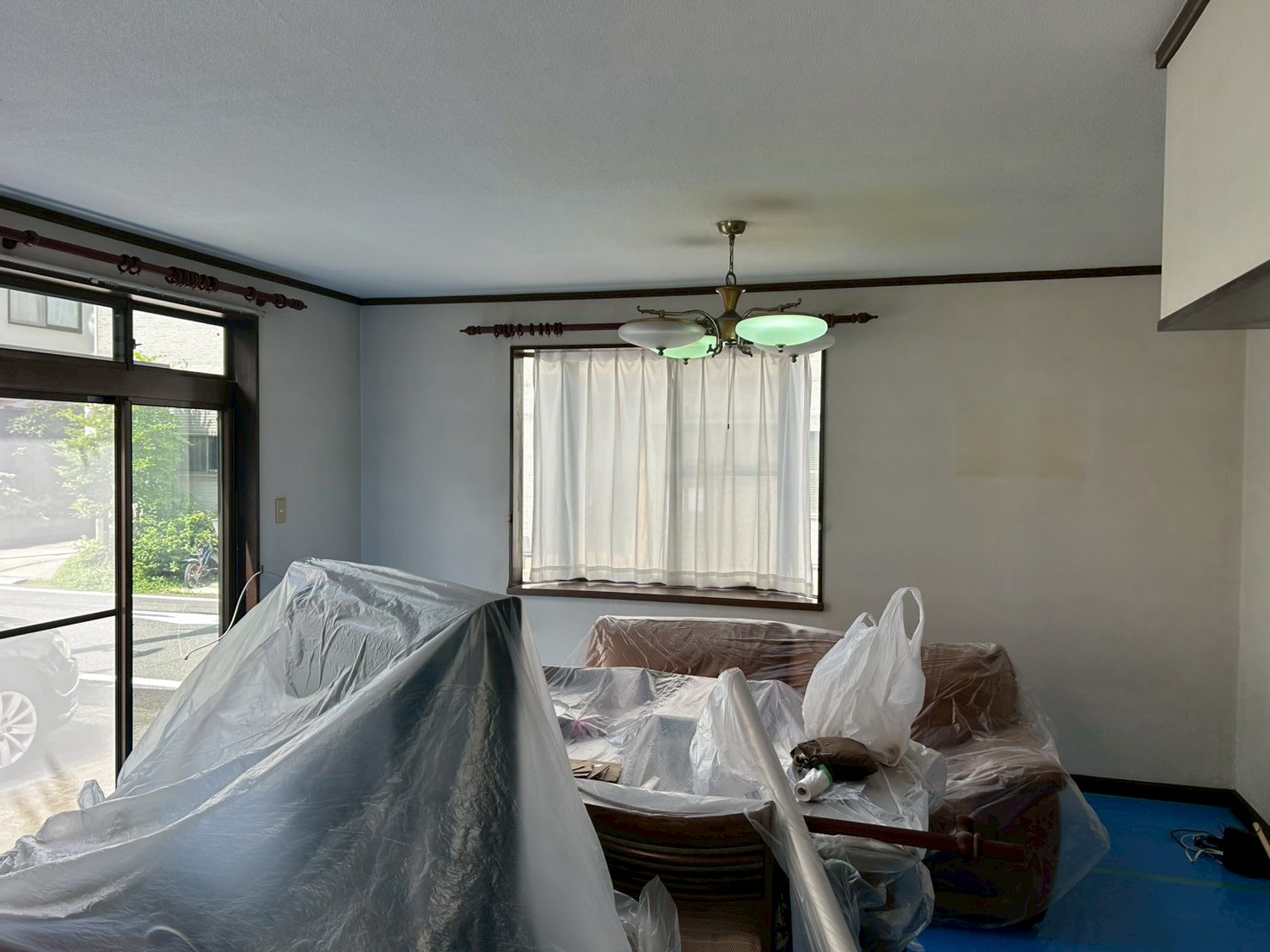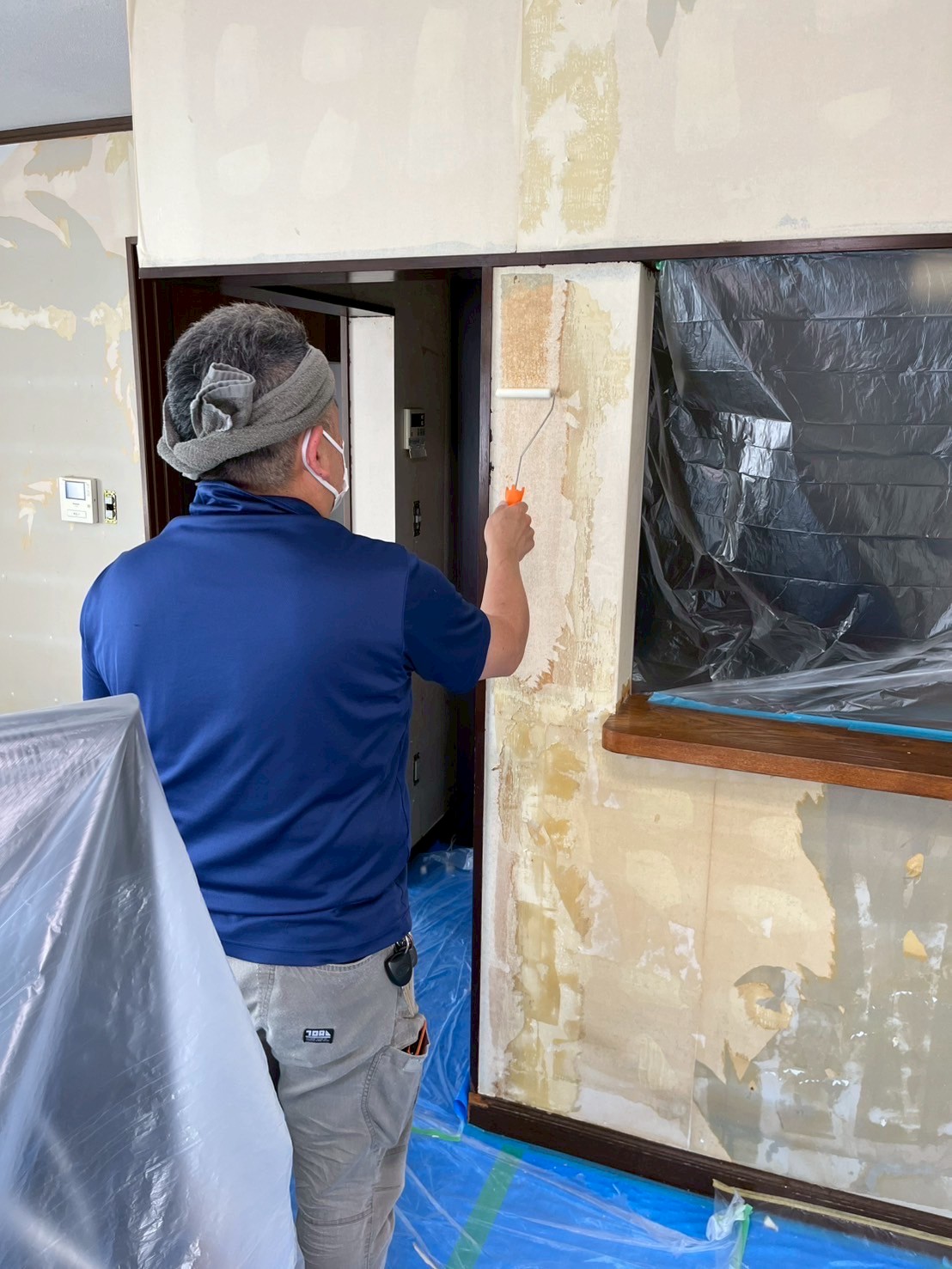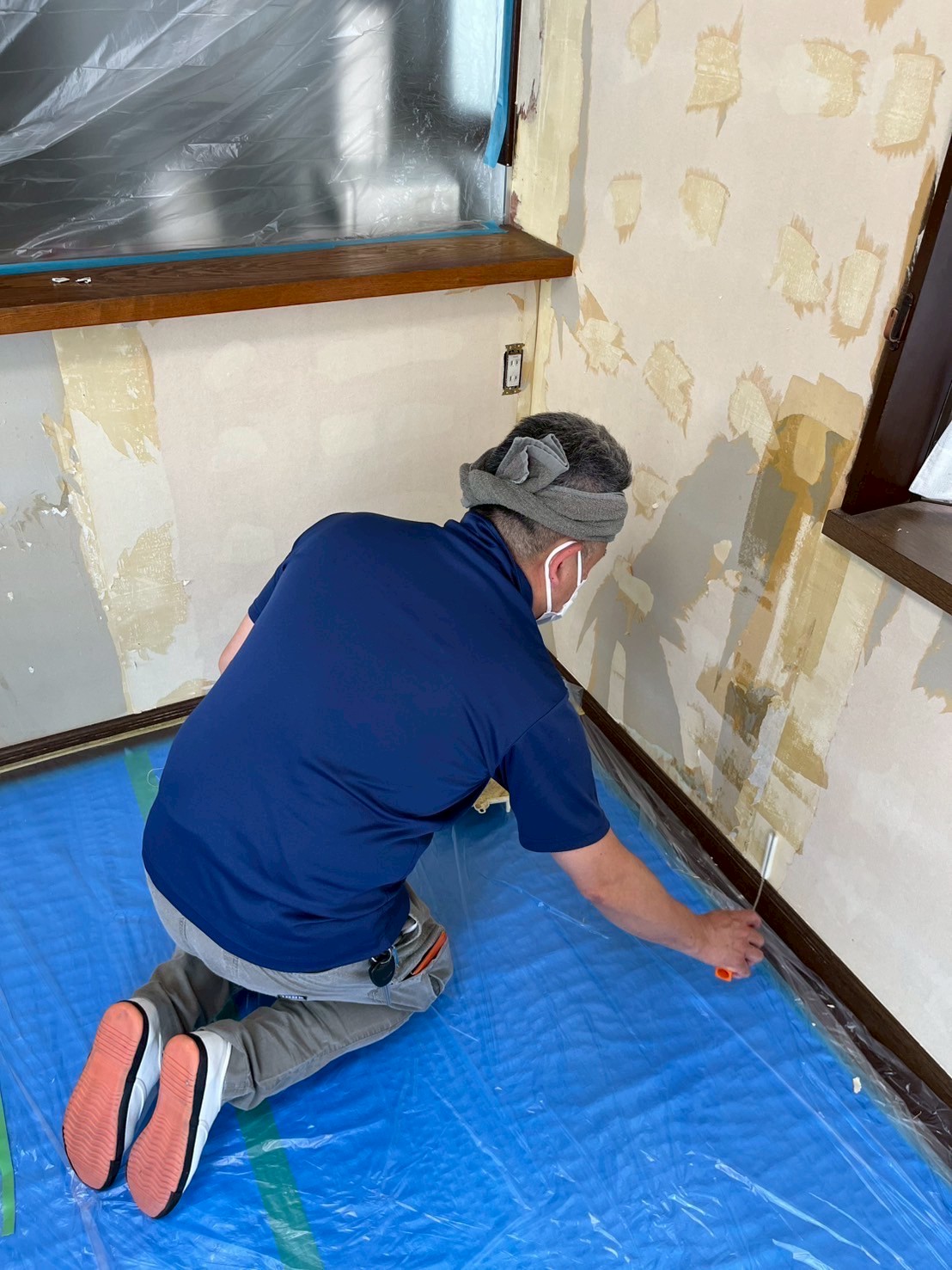まずは、家具や廊下とうに養生をして…